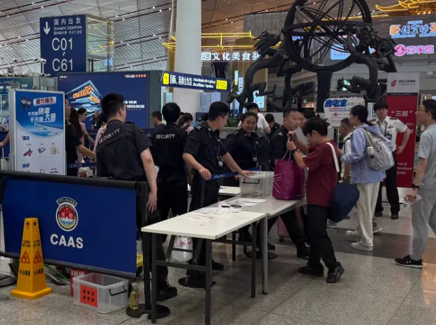 今天上午,记者来到首都机场3号航站楼看到,在国内出发通道前,安检人员搭起充电宝查验台,携带充电宝的旅客可提前拿出充电宝,交给安检人员进行查验。通过查验的充电宝,安检人员会将其放入透明袋中并密封保存,旅客下楼通过安检之后,可以自行将充电宝拆封取出。