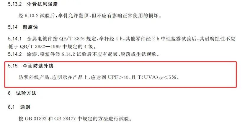 根据我国国家标准 GB/T 23147-2018《晴雨伞》规定,UPF >40 且 T(UVA)AV<5% 的产品方可称为“防紫外线产品”。T(UVA)AV是日光紫外线 UVA 透射比的平均值,反映防晒遮挡效果;该值越小,表明透射量越小。因此,UPF 值越高越好,T(UVA)AV 值则越低越好。