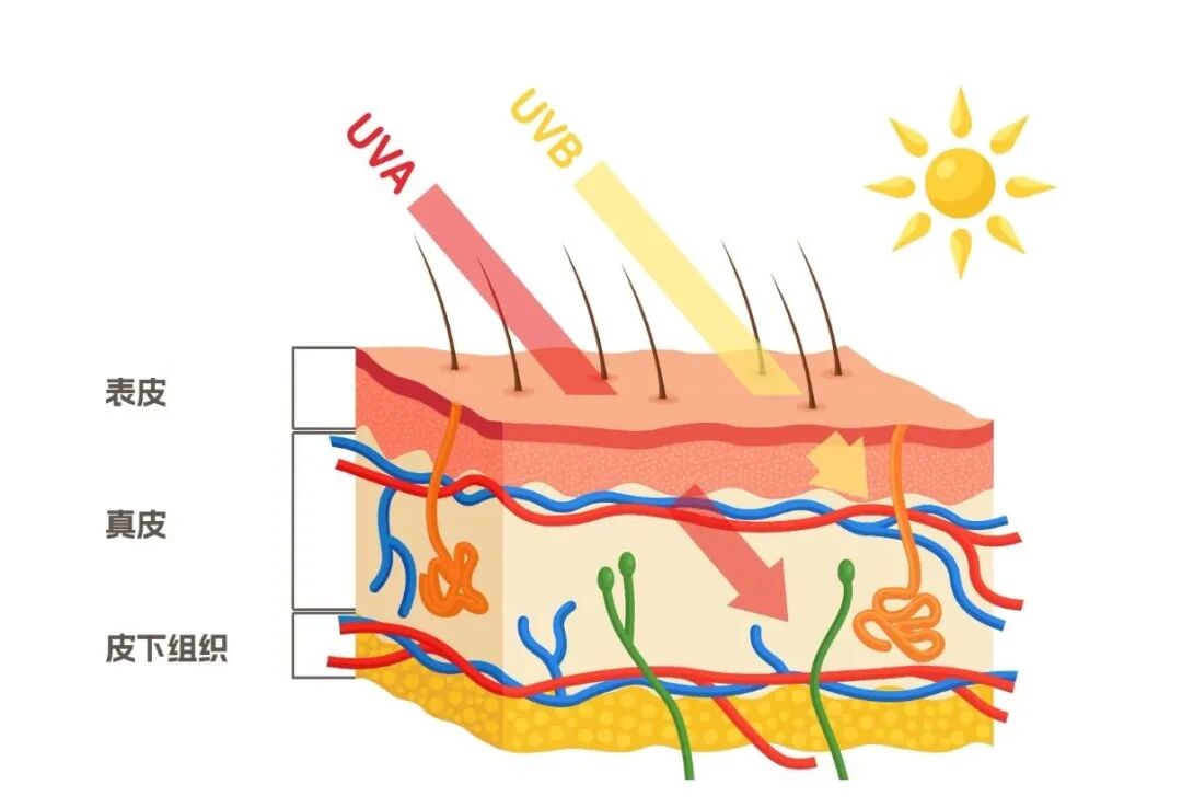 UVA(Ultraviolet A,长波紫外线,320-400nm):穿透力极强,直达真皮层,导致晒黑、光老化(皱纹、斑点),长期积累会增加皮肤癌的风险。