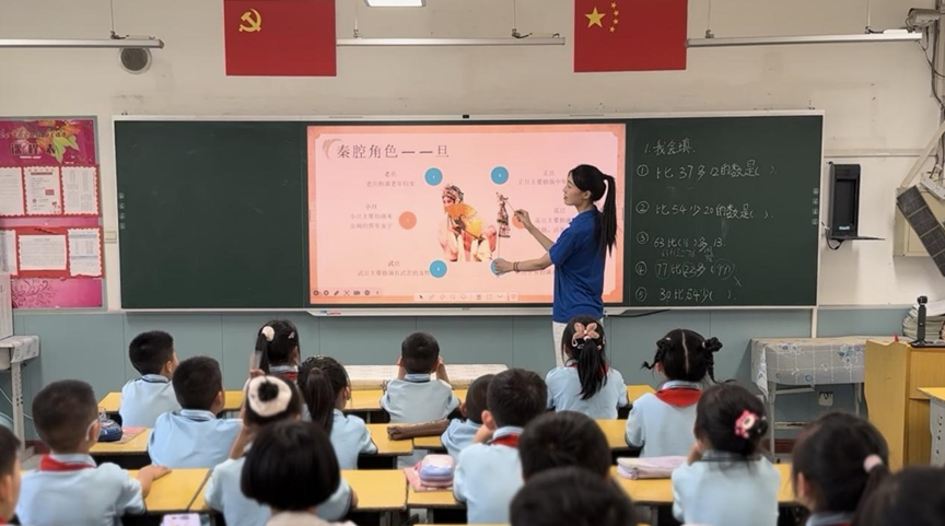 在秦腔课堂教学场景中,激昂的唱段在课堂内回响。随后,秦腔中的生、旦、净、丑角色以皮影形式栩栩如生的展现在学生眼前,