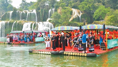 水雾笼罩,银河跌落,瀑声隆隆。德天瀑布下的归春河两岸,各有一只竹排,船头相对,上面人影绰约——中越界河山歌会在此举行。