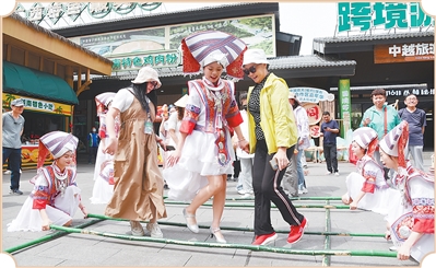 游客在中越德天(板约)瀑布跨境旅游合作区体验民俗。大新县融媒体中心供图
