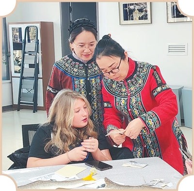 尤雪松(右一)向俄罗斯游客教授鱼皮画制作。石乔摄