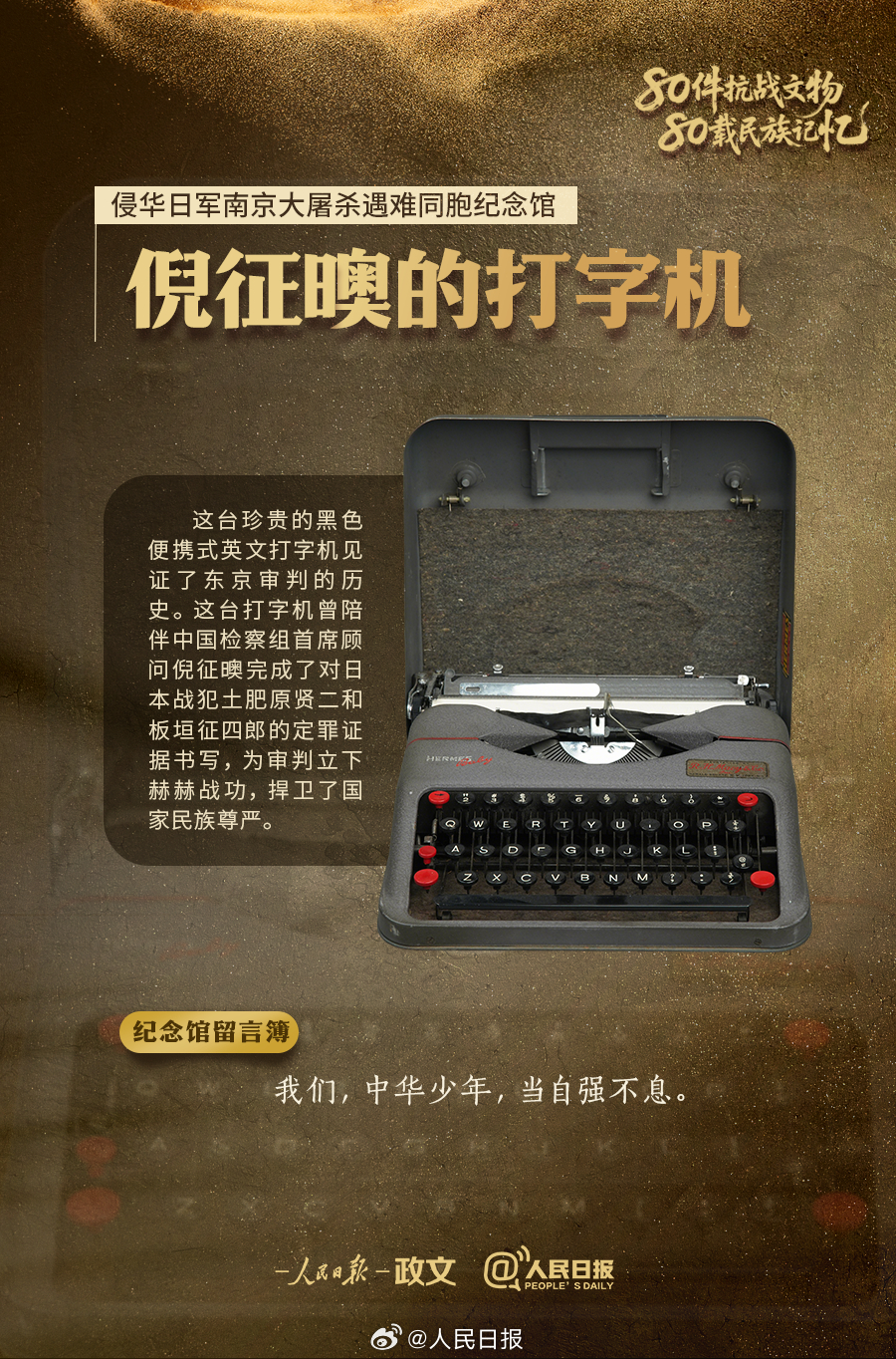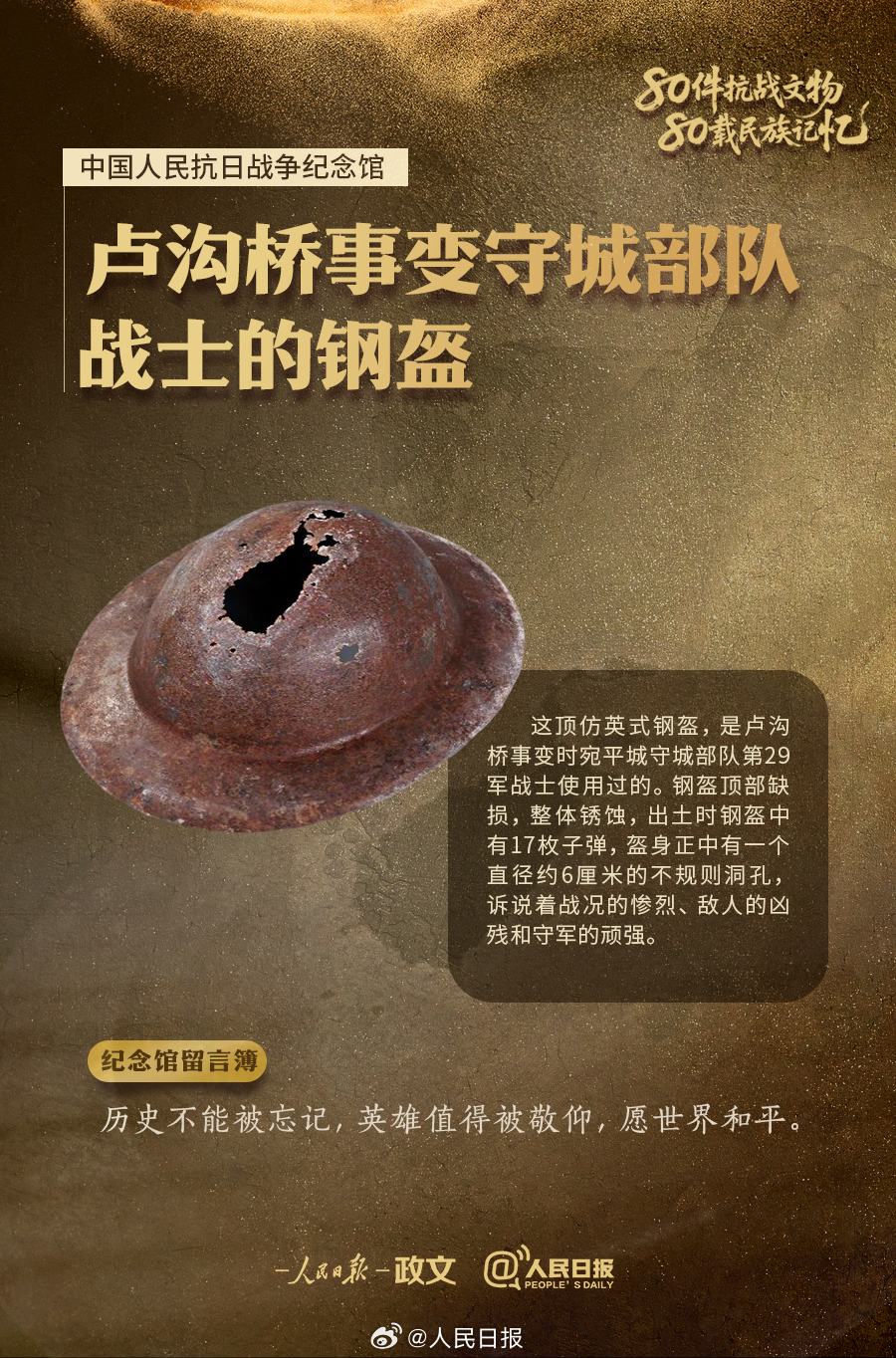 钢盔上的弹孔,诉说着当年战况的惨烈;杨靖宇的马刀,承载着可歌可泣的抗日历史;一台打字机,见证了东京审判的重要时刻……每一件抗战文物都是历史的讲述者。80件抗战文物80载民族记忆系列报道第二期,守护永不褪色的抗战记忆!