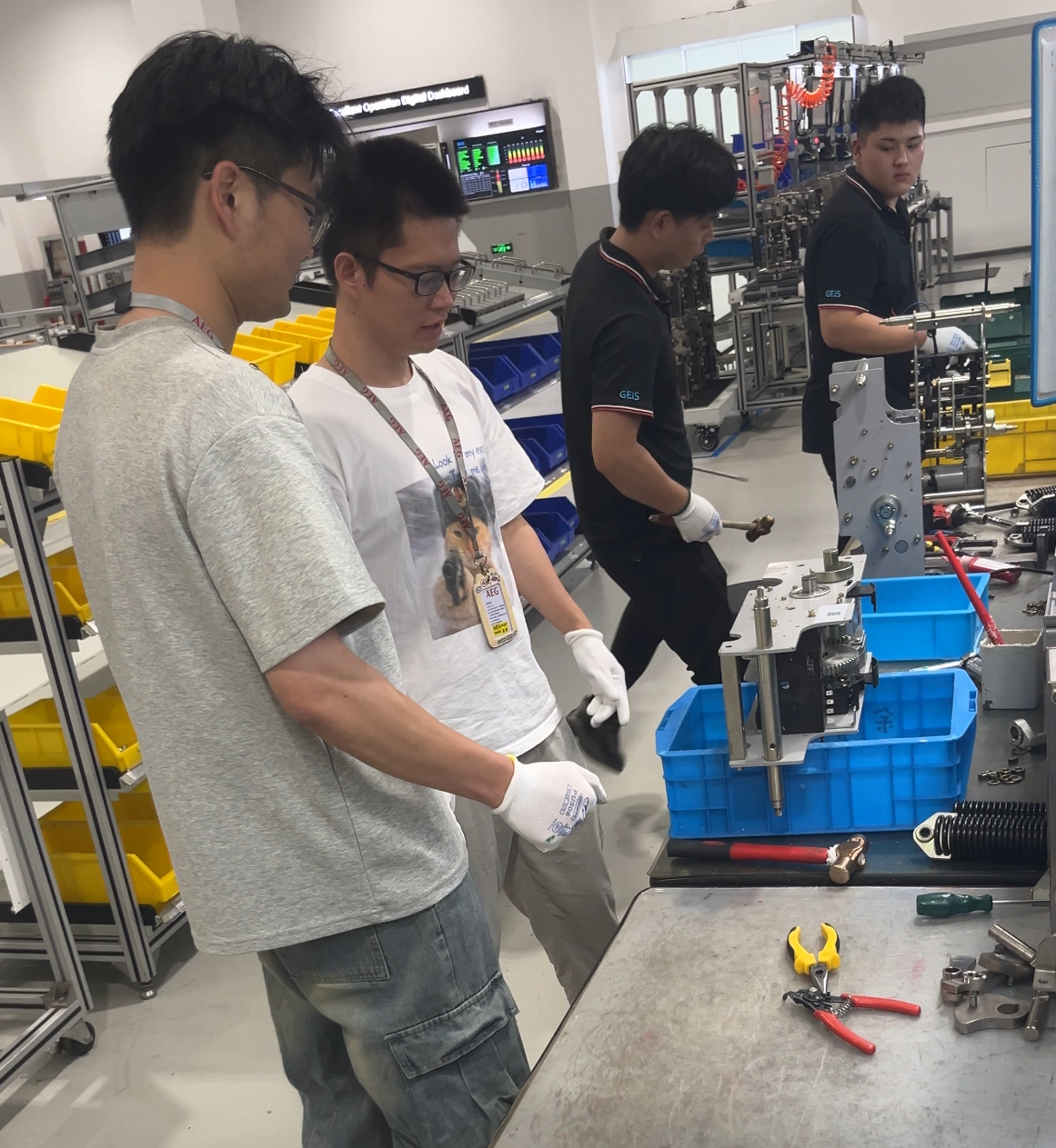企业导师指导学生研究高压断路器生产线中的机器主体机构的组装。 上海电机学院供图