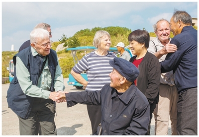 英军战俘后人与林阿根(前排老者)、中国渔民后代见面。 |