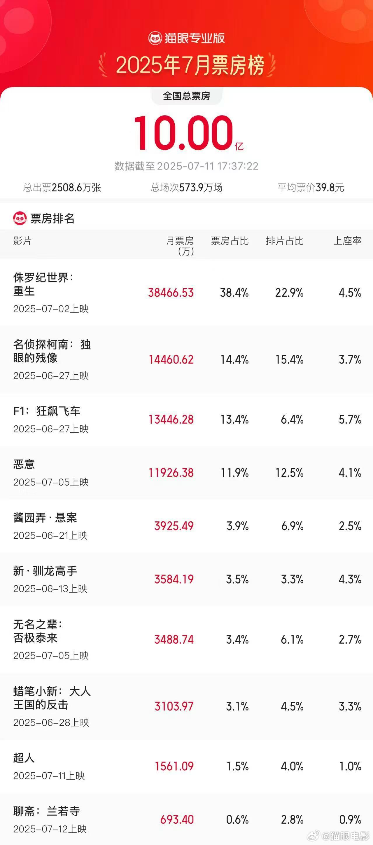 据猫眼专业版数据,7月11日17时37分,2025年7月总票房破10亿,《侏罗纪世界:重生》《名侦探柯南:独眼的残像》《F1:狂飙飞车》分列7月票房榜前三位。