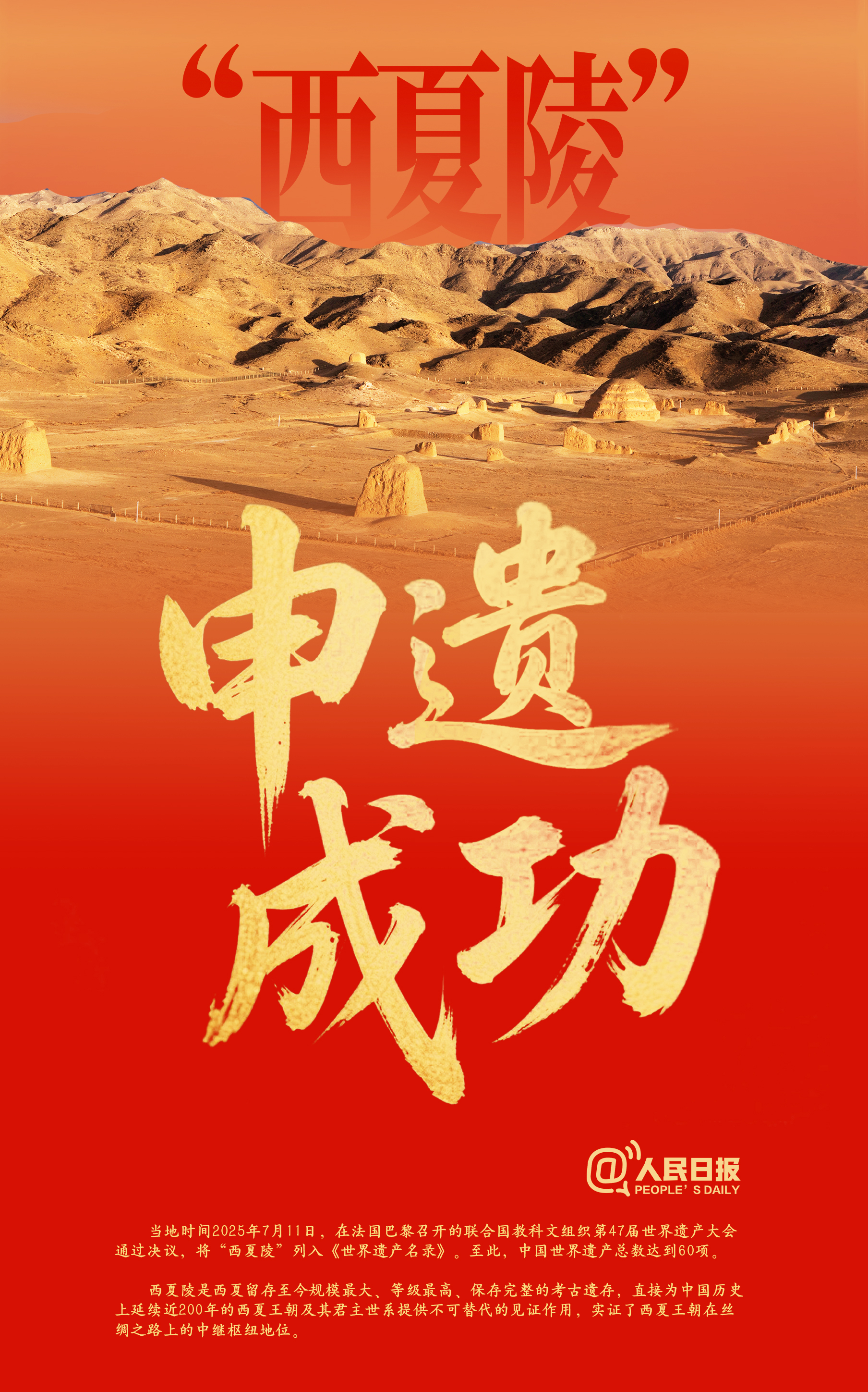 当地时间2025年7月11日16时23分,在法国巴黎召开的联合国教科文组织第47届世界遗产大会通过决议,将“西夏陵”列入《世界遗产名录》。至此,中国世界遗产总数达到60项。