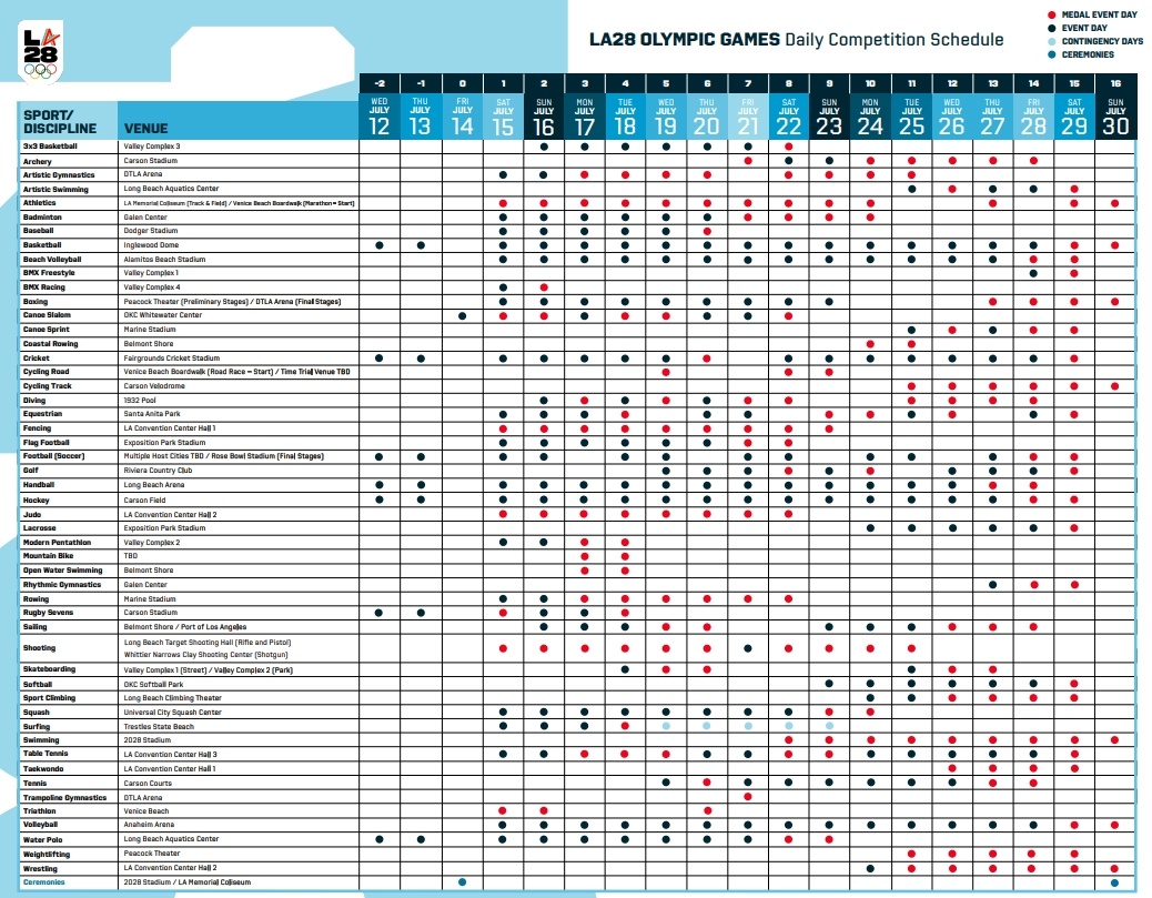当地时间7月14日,在2028年洛杉矶奥运会倒计时三周年到来之际,组委会公布了竞赛日程。