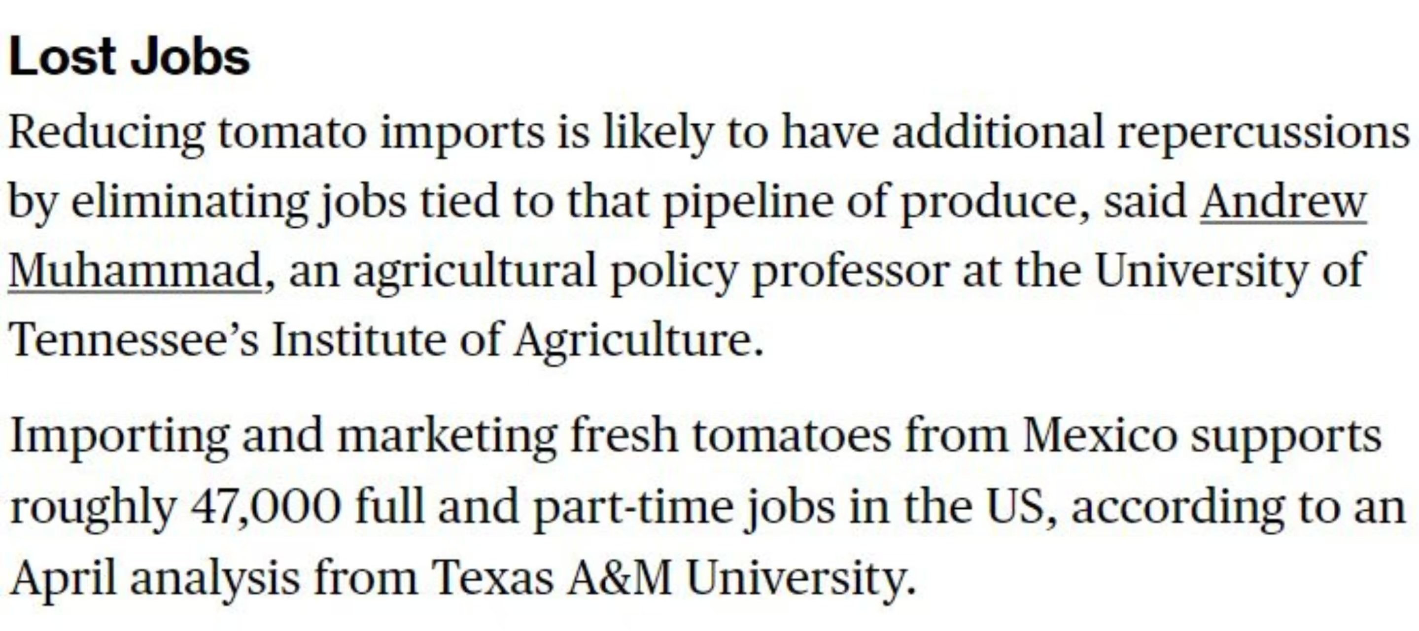 美国田纳西大学农业研究所教授安德鲁·穆罕默德警告说,减少番茄进口还可能减少与此相关的就业机会。