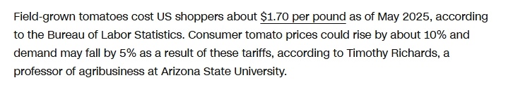 美国劳工统计局的数据显示,截至今年5月,田间种植的西红柿在美国每磅售价约为1.7美元(约合每公斤26.8元人民币)。亚利桑那州立大学教授蒂莫西•理查兹表示,征收关税后,美国番茄价格可能上涨10%左右,而需求可能下降5%。