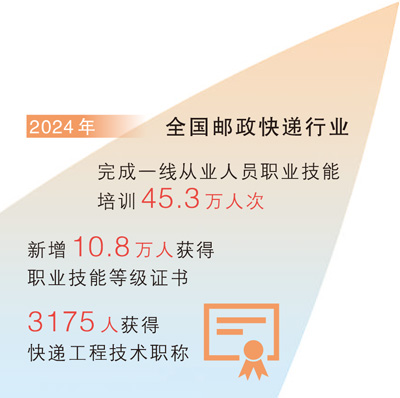 培训“传帮带”,大街小巷跑出快递员工匠。2024年,全国邮政快递行业完成一线从业人员职业技能培训45.3万人次,新增10.8万人获得职业技能等级证书、3175人获得快递工程技术职称。