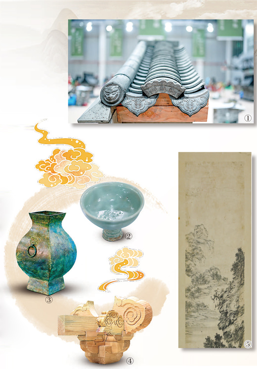 图①②③④⑤分别为第二届全国文物行业职业技能大赛泥瓦作文物修复师、陶瓷文物修复师、金属文物修复师、木作文物修复师、纸张书画文物修复师赛项修复的文物和作品。