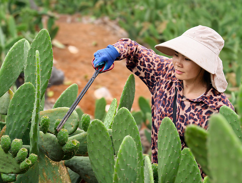 “从前山上净是白花花的石头,现在走几步,就能瞅见沉甸甸的仙人果挂在掌片上,绿得发亮!”村民马成丽握着亮闪闪的采摘钳,指尖翻飞间,带刺的果子落进竹篓。作为最早参与种植的农户,她的5亩仙人掌去年给家里挣回4万多元,彻底告别了“靠天吃饭”的日子。