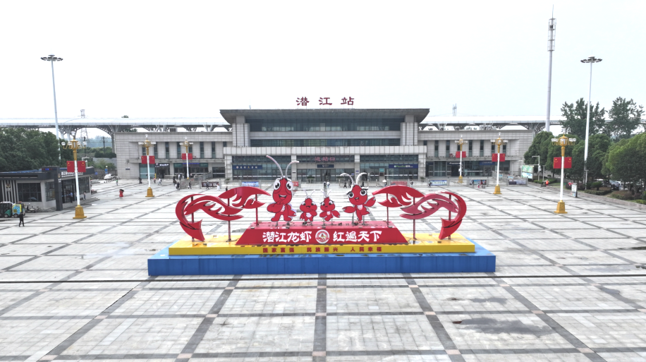 2012年7月1日,潜江站正式开通运营。站前广场上,一组以龙虾为主题的巨型雕塑引人注目,赤色龙虾雕塑昂首向天,热情迎接八方来客。