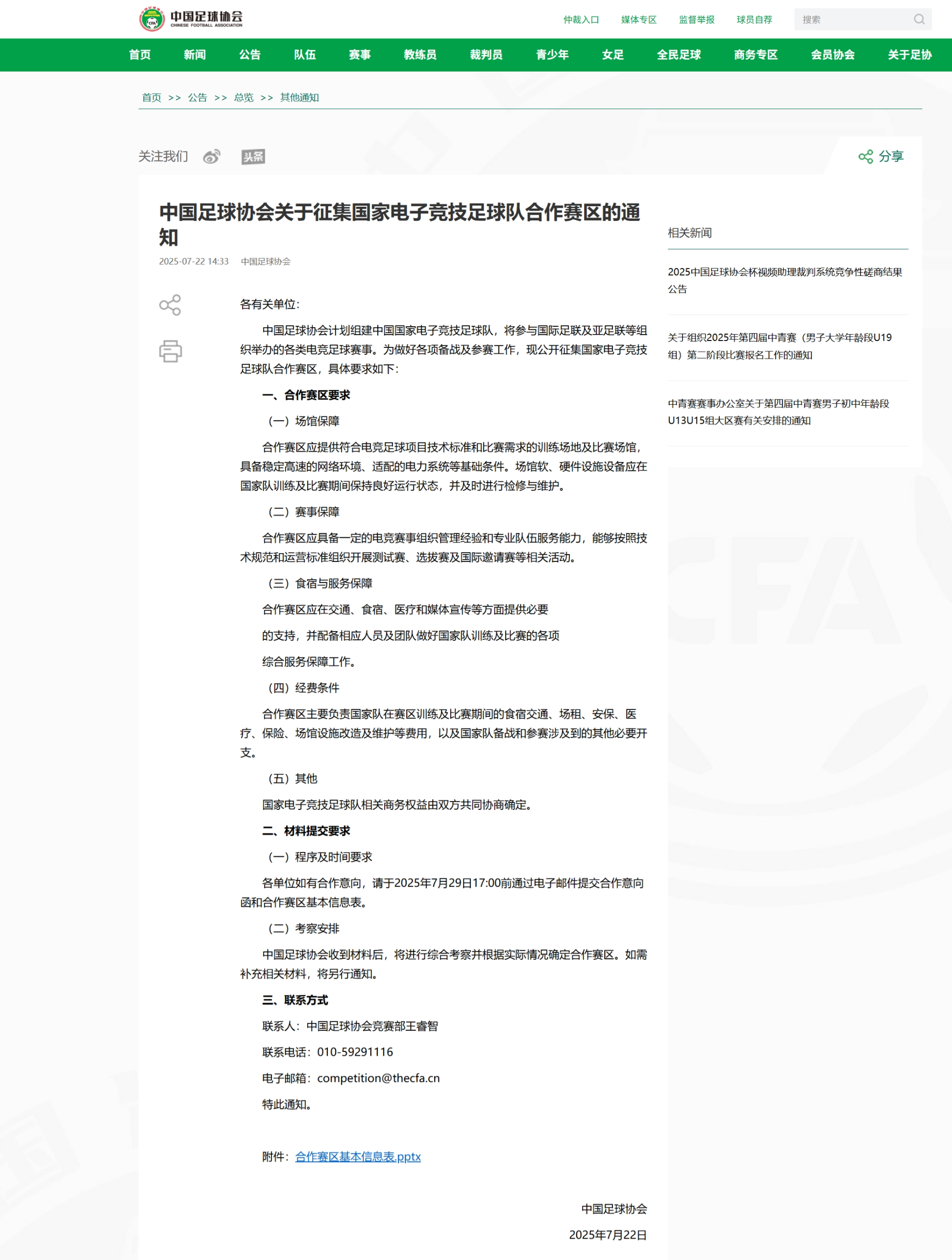 7月22日,中国足协网站发布《关于征集国家电子竞技足球队合作赛区的通知 》。其中提到,中国足球协会计划组建中国国家电子竞技足球队,将参与国际足联及亚足联等组织举办的各类电竞足球赛事。