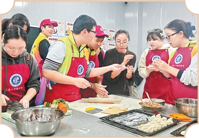 二连浩特第一中学的中蒙两国师生在包饺子。 |