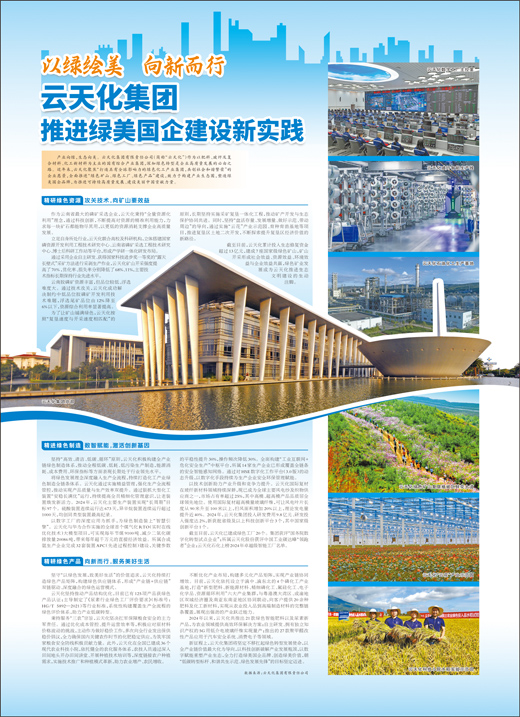 产业向绿,生态向美。云天化集团有限责任公司(简称“云天化”)作为以肥料、玻纤及复合材料、化工新材料为主业的国有综合产业集团,深知绿色转型是企业高质量发展的必由之路。近年来,云天化聚焦“打造具有全球影响力的绿色化工产业集团,共创社会和谐繁荣”的企业愿景,全面推进“绿色矿山、绿色工厂、绿色产品”建设,致力于构建产业生态圈,塑造绿美国企品牌,为推进可持续高质量发展、建设美丽中国贡献力量。