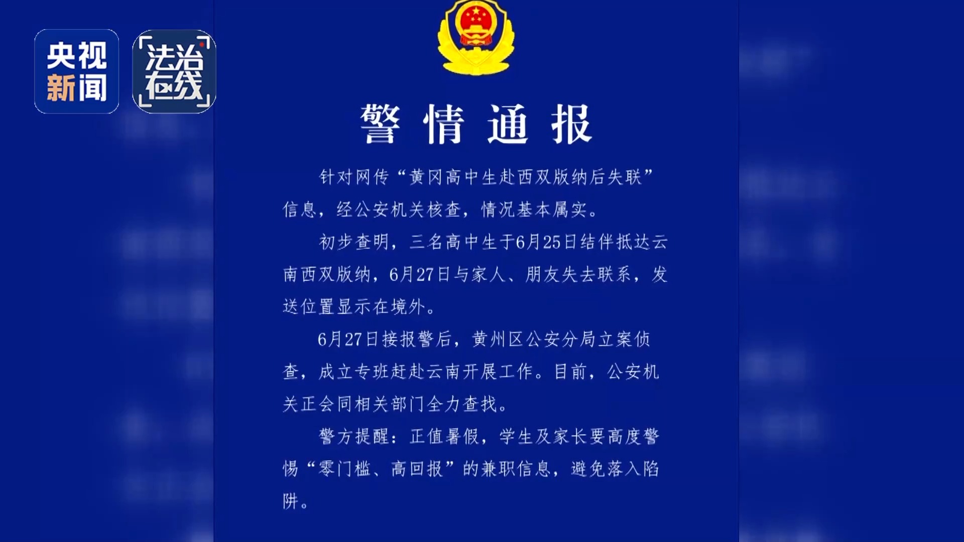 7月16日,湖北黄冈警方发布警情通报,三名高中生于6月25日接班抵达云南西双版纳,6月27日与家人、朋友失去联系,发送位置显示在境外。