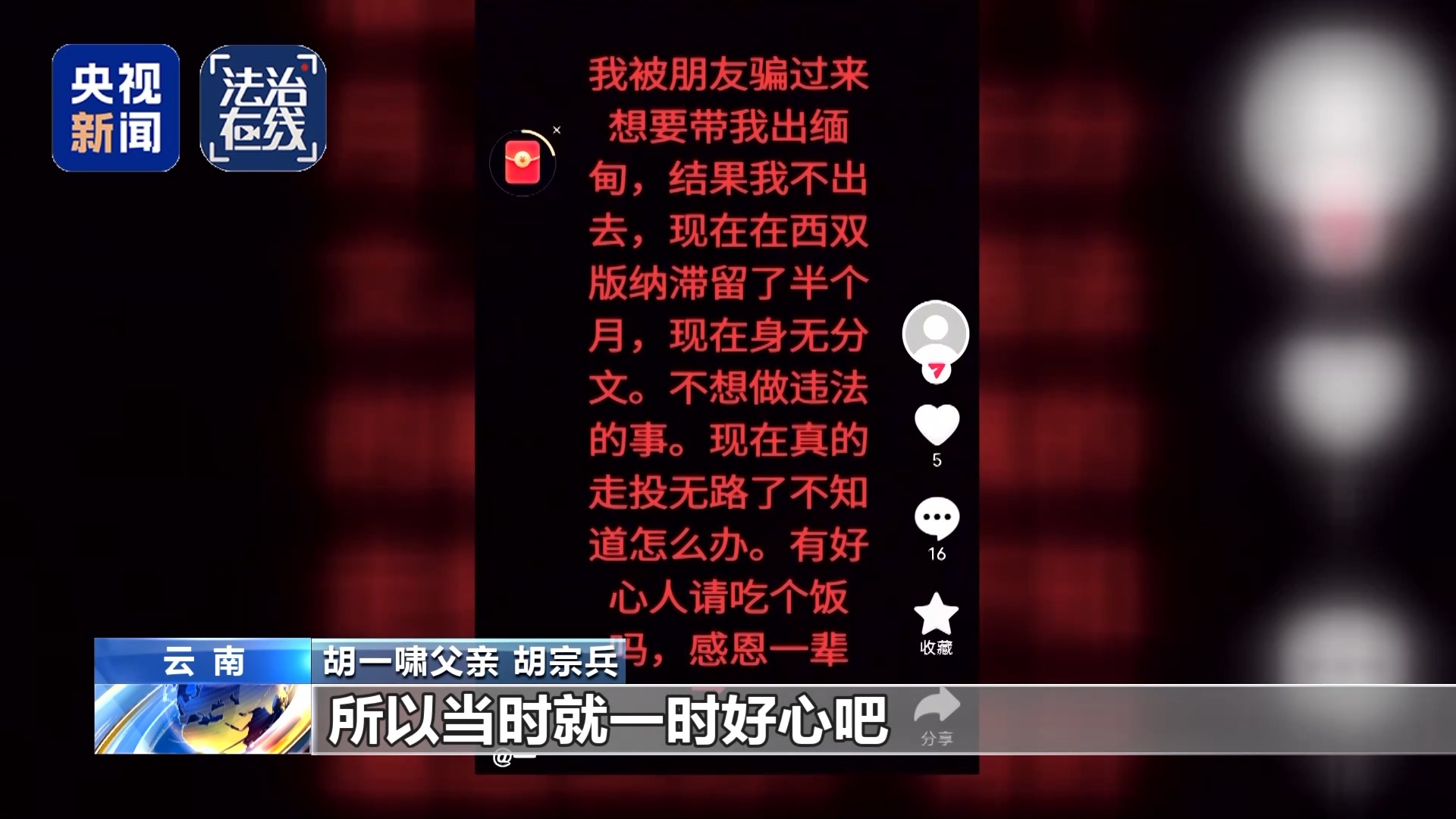 胡宗兵说,他本来想去试一试,但在找孩子过程中,他听说过不少失联孩子家长被骗的经历,所以放弃了这个念头。在西双版纳找孩子期间,胡宗兵还救助了一名被“高薪招聘”骗过来的男青年。