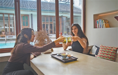 图为玛雅(右)和同伴在南浔民宿品尝“三道茶”。王涵摄(人民视觉)