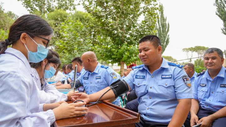 实践队最后一站来到了“全国优秀公安基层单位”乃则尔巴格镇派出所,队员们聆听民警讲述日常执法的故事,并为广大民辅警进行现场诊疗。针对警察职业特性,队员们为广大民辅警进行一对一健康诊断,普及糖尿病、高血压防治知识,讲解肩颈腰椎养护等日常保健知识,并手把手传授穴位按摩等实用康复技巧。