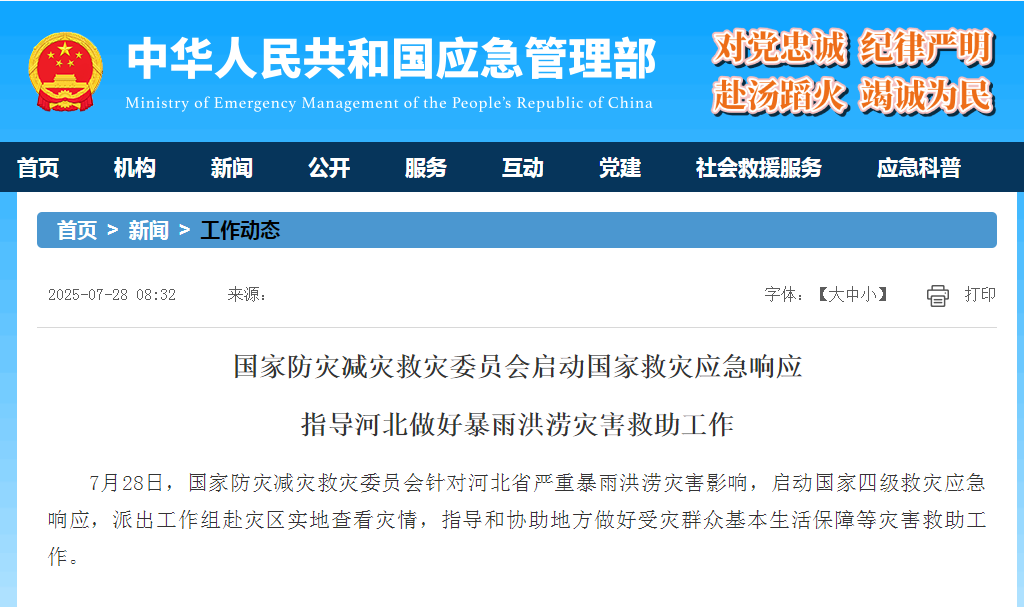 7月28日,国家防灾减灾救灾委员会针对河北省严重暴雨洪涝灾害影响,启动国家四级救灾应急响应,派出工作组赴灾区实地查看灾情,指导和协助地方做好受灾群众基本生活保障等灾害救助工作。