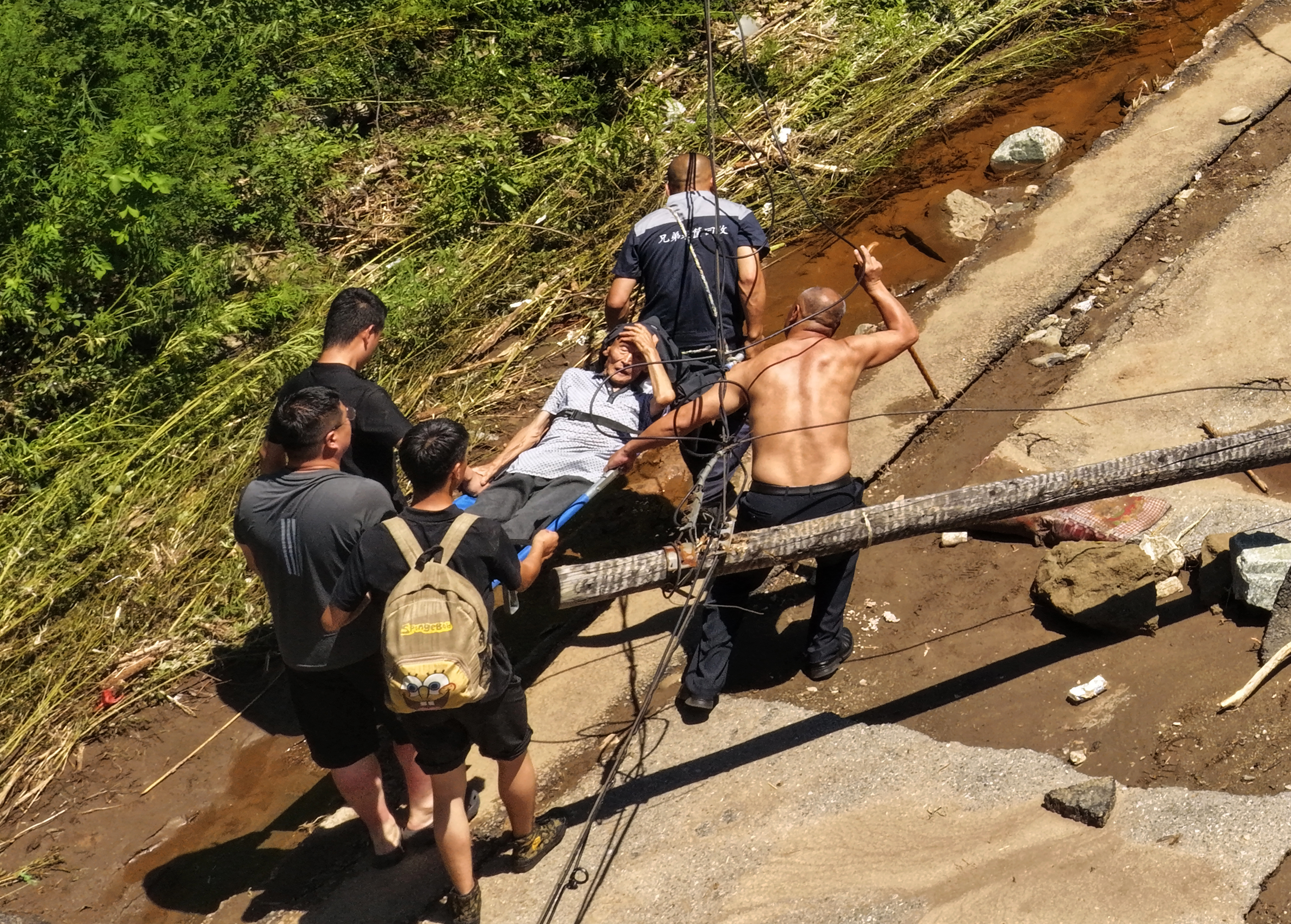 路上,记者遇到了最后一名被转运的受灾群众。那段路是下坡,坡度大,水流急。滦平县人大常委会副主任冷雪松和3名县里的干部紧握着担架,护送着小腿骨折的西沟村村民郑君芝,小心翼翼。