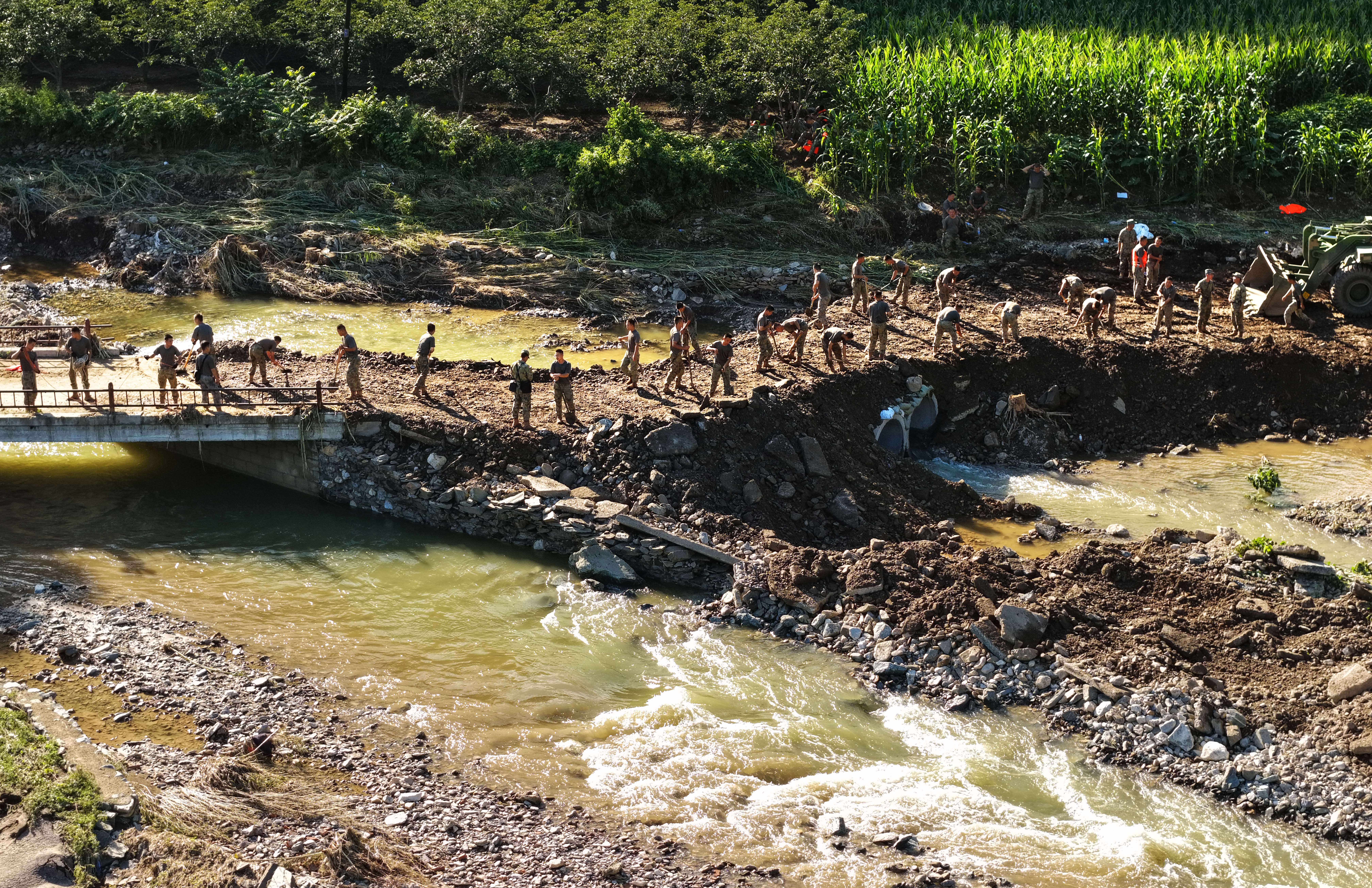 7月30日,陆军第82集团军某旅官兵抢修一处垮塌桥梁。