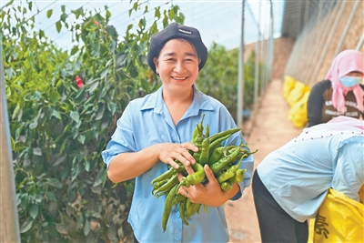 图为杨生梅在海燕村千亩现代设施农业园区采摘辣椒。