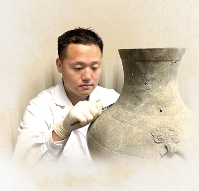 初中毕业后,赵明辉在电视上看到了《我在故宫修文物》的纪录片,被片中文物修复师的工作深深吸引,他深受触动,毅然选择了“家人说太冷门”的文物保护与修复专业。赵明辉摩挲着铜罍腹部的蟠螭纹,若有所思:“我常想,古代的工匠真的很了不起,用那么简陋的工具就可以做出这么伟大的作品。而我有幸将它们还原,也有一脉相承的匠心。”