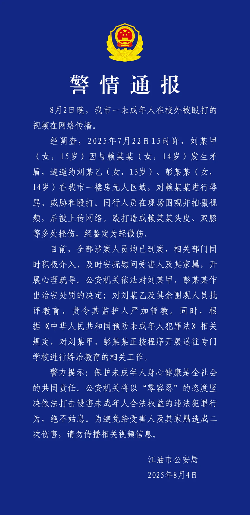 8月4日,四川江油警方通报14岁女孩被殴打处理结果:2人被治安处罚并转送专门学校。