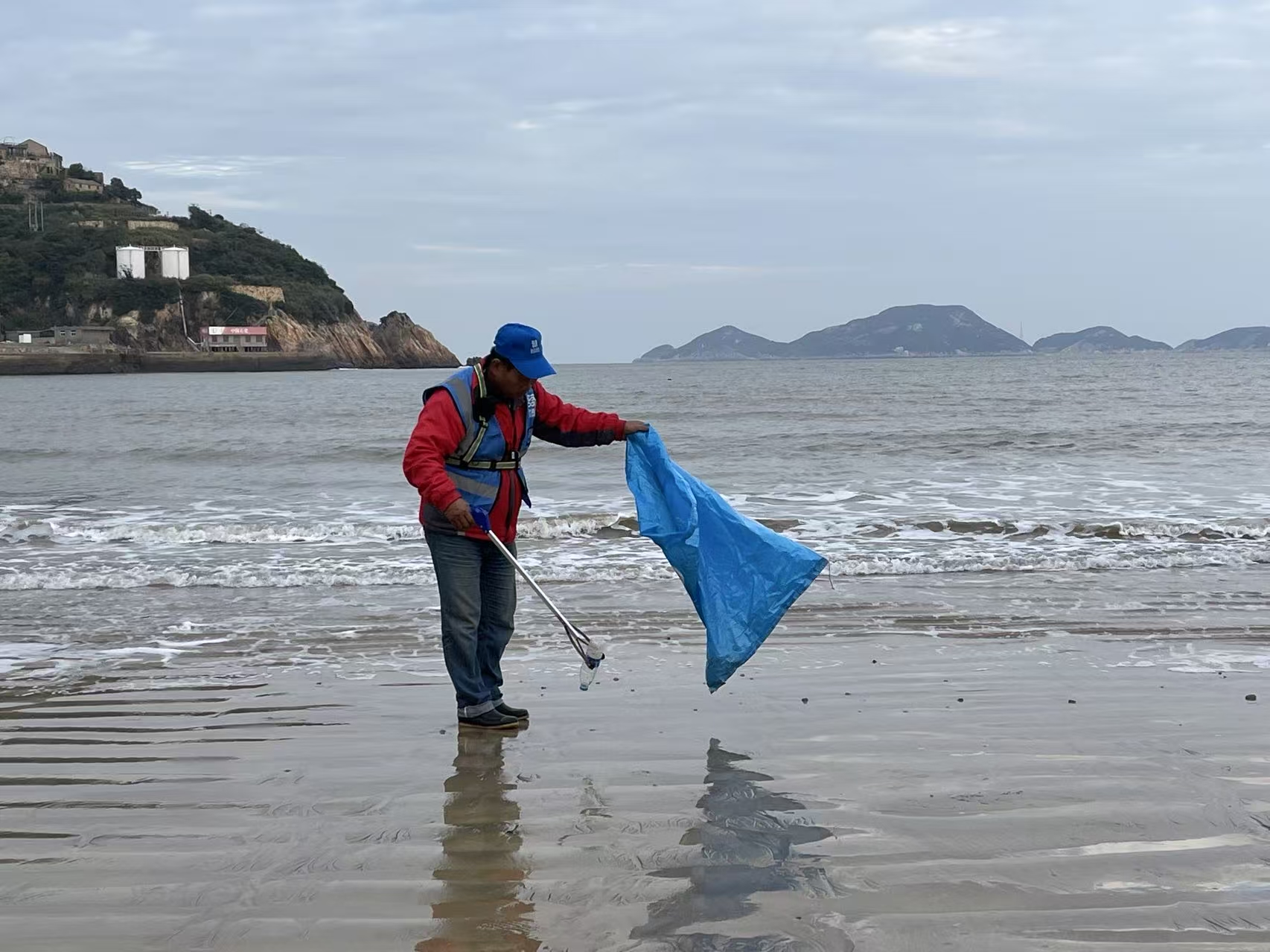 浙江台州温岭市石塘半岛金沙滩公园里,身着“蓝色循环”字样蓝色马甲的李启明,一手拿着长柄垃圾钳,一手拿着编织袋,将散落在沙滩上的塑料瓶夹起来。(资料图片)