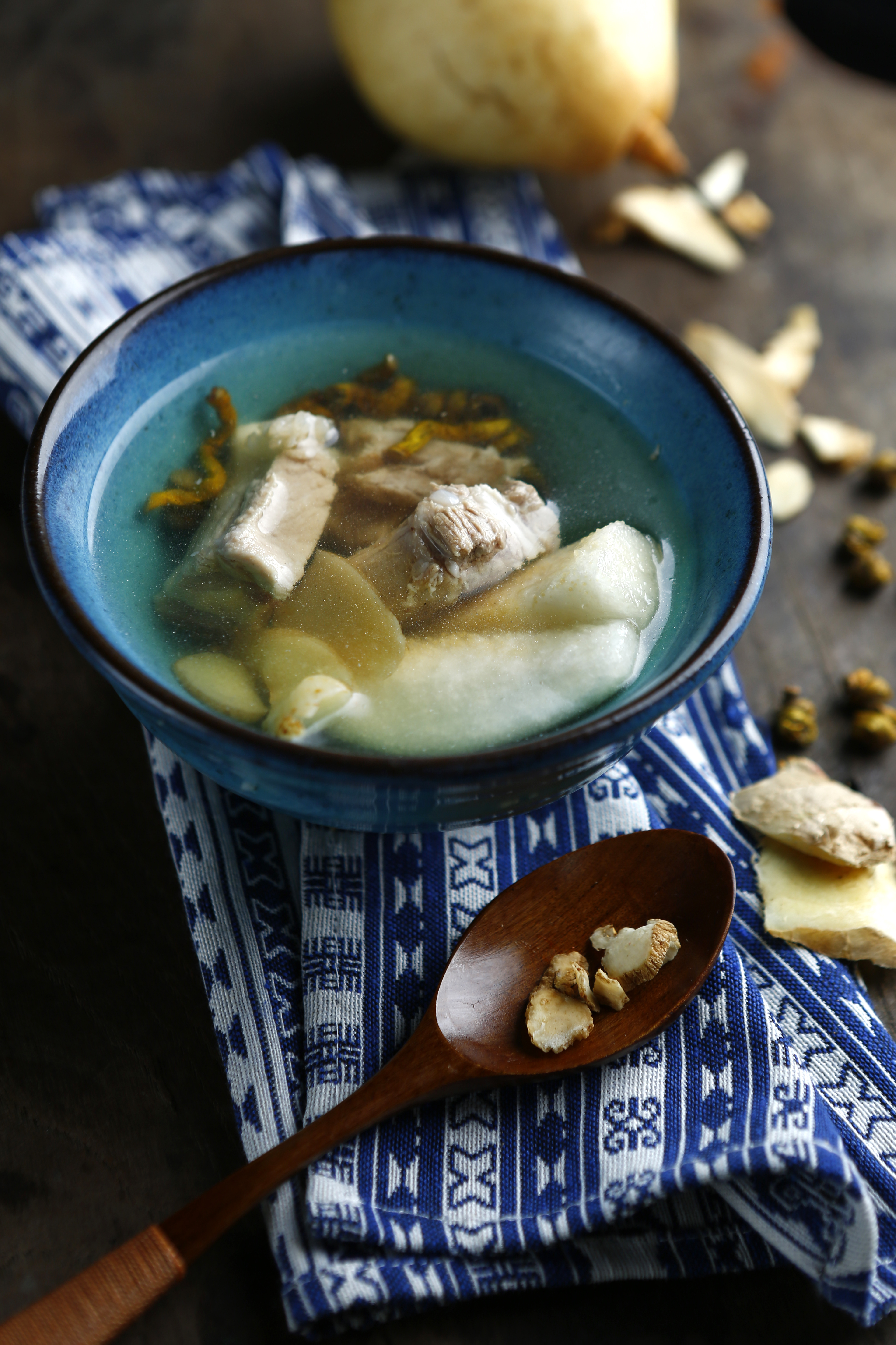 (1) 菜品特点:梨,《本草备要》载:“(性)甘微酸寒,(能)润肺凉心、消痰降火、止渴解酒、利大小肠”,因其鲜嫩多汁、酸甜适口,故有“天然矿泉水”之称。“熟者滋五脏之阴”,吃熟水果既能避免瓜果的寒湿之性又能滋养脏腑。石斛有益胃生津、滋阴清热的功效。玉竹,味甘性平,能补中益气,润心肺。整个汤膳能滋润脏腑,能改善咽干口燥、便秘、皮肤干燥等不适,适合长期吸烟、熬夜人群及大众秋季保健食用。