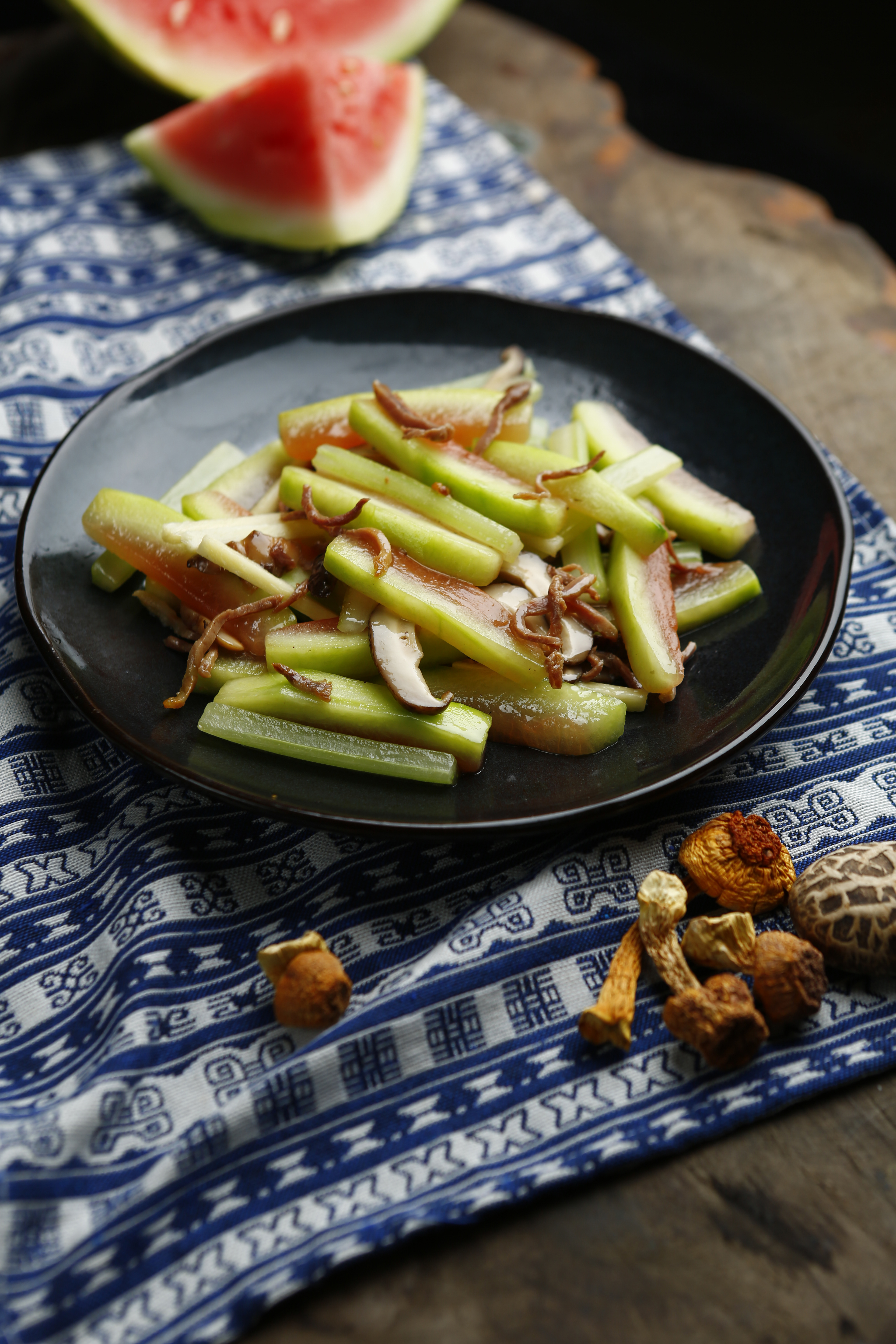 (1)菜品特点:西瓜皮是我国传统医学的常用中药之一,药名为西瓜翠衣,性凉味甘,入脾胃二经,具有清暑解热,止渴生津,利小便的作用。它搭配色红的火腿,青绿的香芹,佐以开胃的香菇,烹饪一道色彩丰富,口感爽脆,味道鲜甜的菜肴,诚为夏日消暑的食疗佳品,尤其适合湿热体质而见口气重、小便黄、舌苔厚腻的人群食用。
