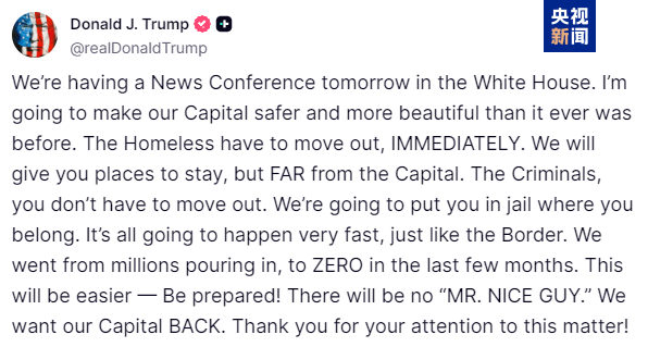 当地时间8月10日,美国总统特朗普在其社交媒体“真实社交”上发文表示,将于次日在白宫举行记者会,宣布一系列旨在让首都“比以往更安全、更美丽”的措施。
