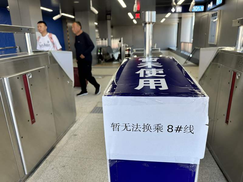 记者注意到,刚一走进出入口就能看到改造后的变化。在下行电梯外,新加装了多台检票闸机,不过它们并没有开启,在检票闸机上还贴有“暂未使用”的标识。地铁站C口内的一侧依然立着施工围挡,同样张贴有“暂未使用”的标识,在旁边的立柱上也贴着提示——暂无法换乘8号线。记者了解到,这些改造的目的是将C口内的安检和检票环节前移至地面层,在C口进站后可以直接选择前往8号线或者10号线。