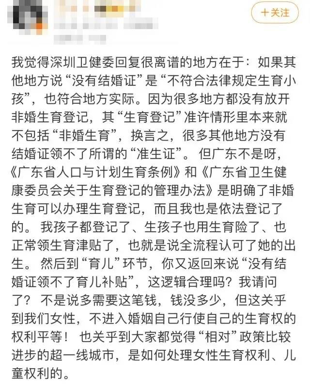 该网友进一步表达了对上述回复的不解,因为根据《广东省人口与计划生育条例》和《广东省卫生健康委员会关于生育登记的管理办法》,明确了非婚生育可以办理生育登记。“我也是依法登记了的。我孩子都登记了,生孩子也用生育险了,也正常领生育津贴了,也就是说全流程认可了她的出生。”