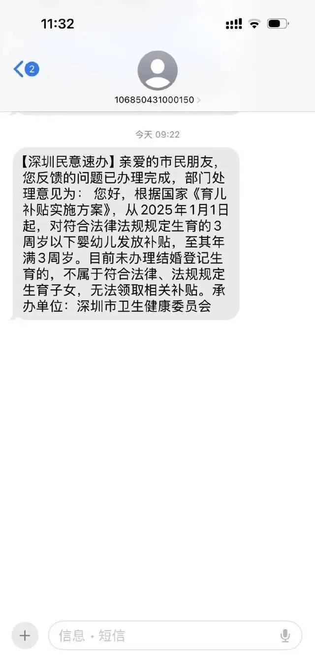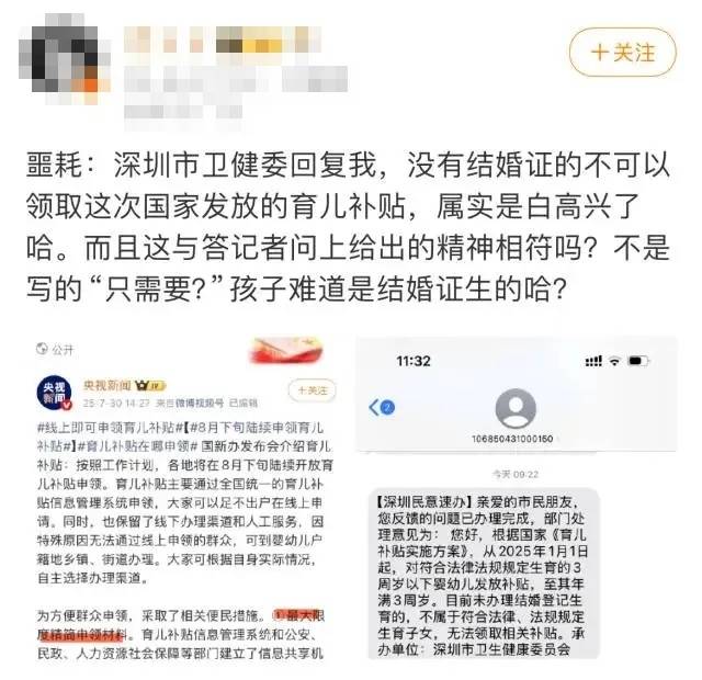 8月6日,有网友发文反映称,自己收到深圳卫生健康委短信告知,因其未办理结婚登记生育,不属于符合法律、法规规定生育子女,无法领取相关育儿补贴,相关贴文立即引起网友热议。