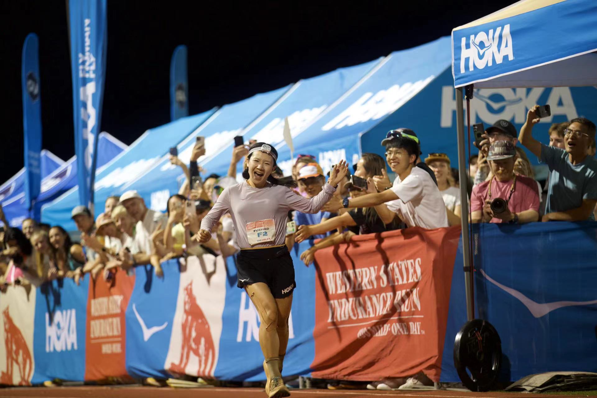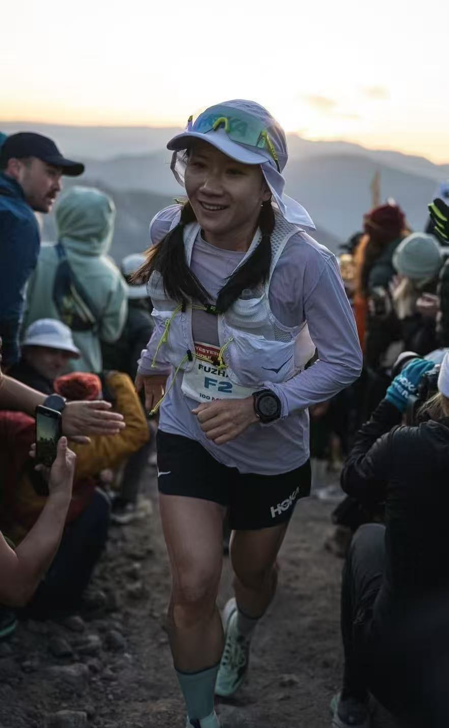 6月29日,经过161公里的翻山越岭、你追我赶,中国越野跑运动员向付召逐一同夹道欢迎的观众击掌,并在终点计时方门下奋力跳起、振臂一呼,成绩定格在16小时47分09秒,2025年美国西部100越野赛的女子亚军诞生!