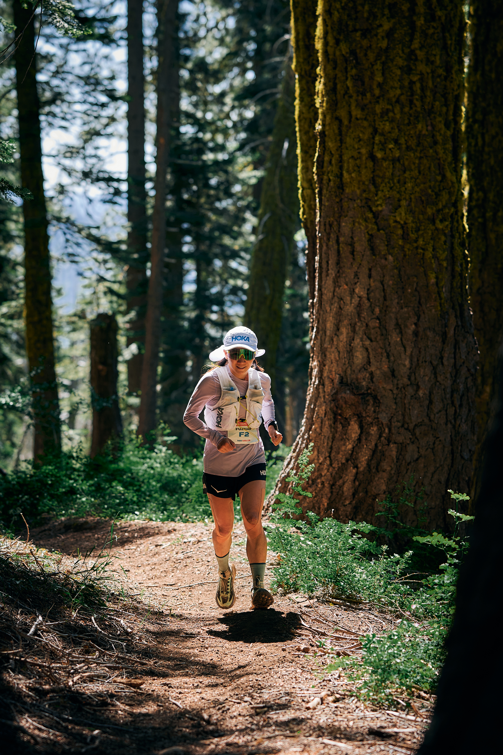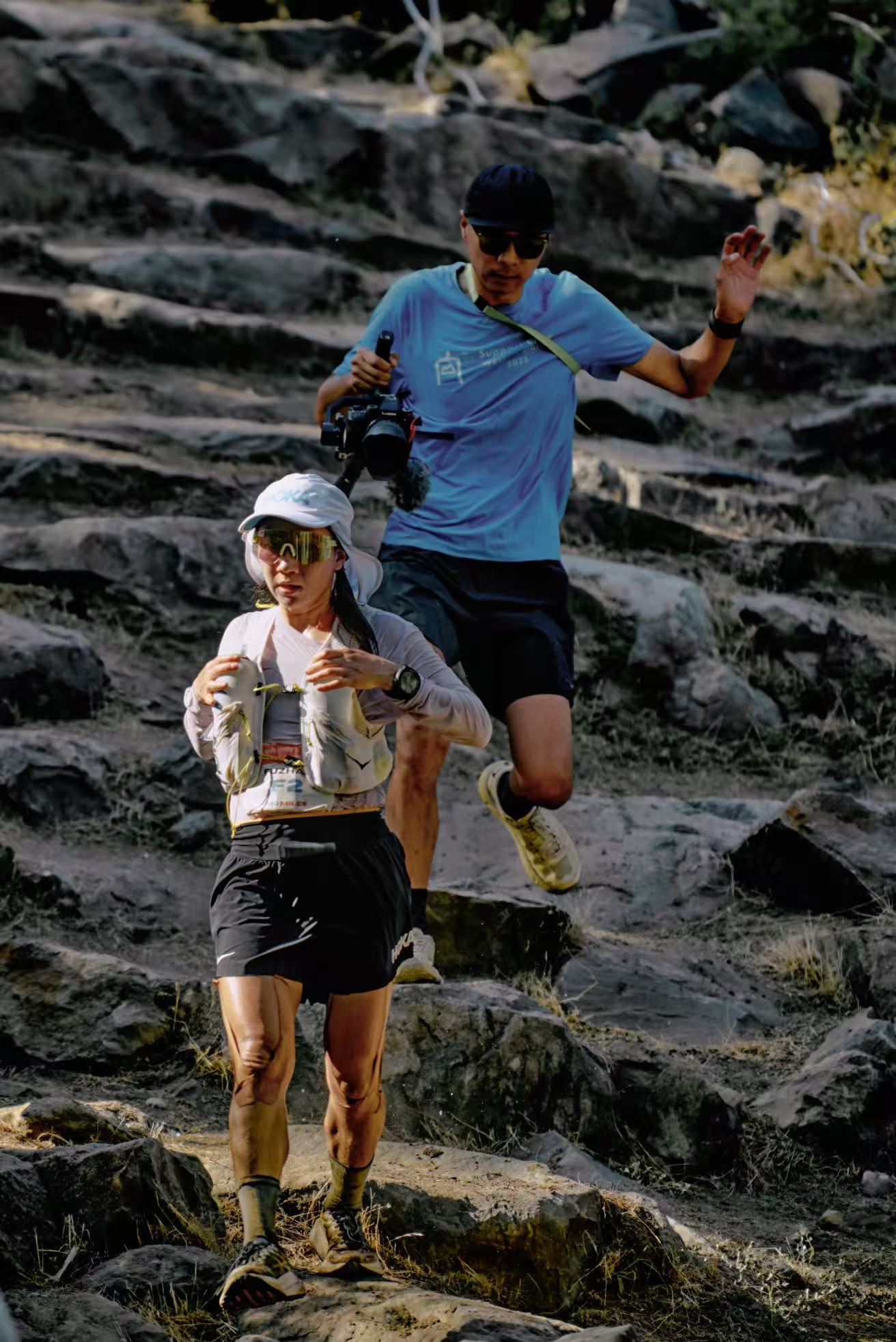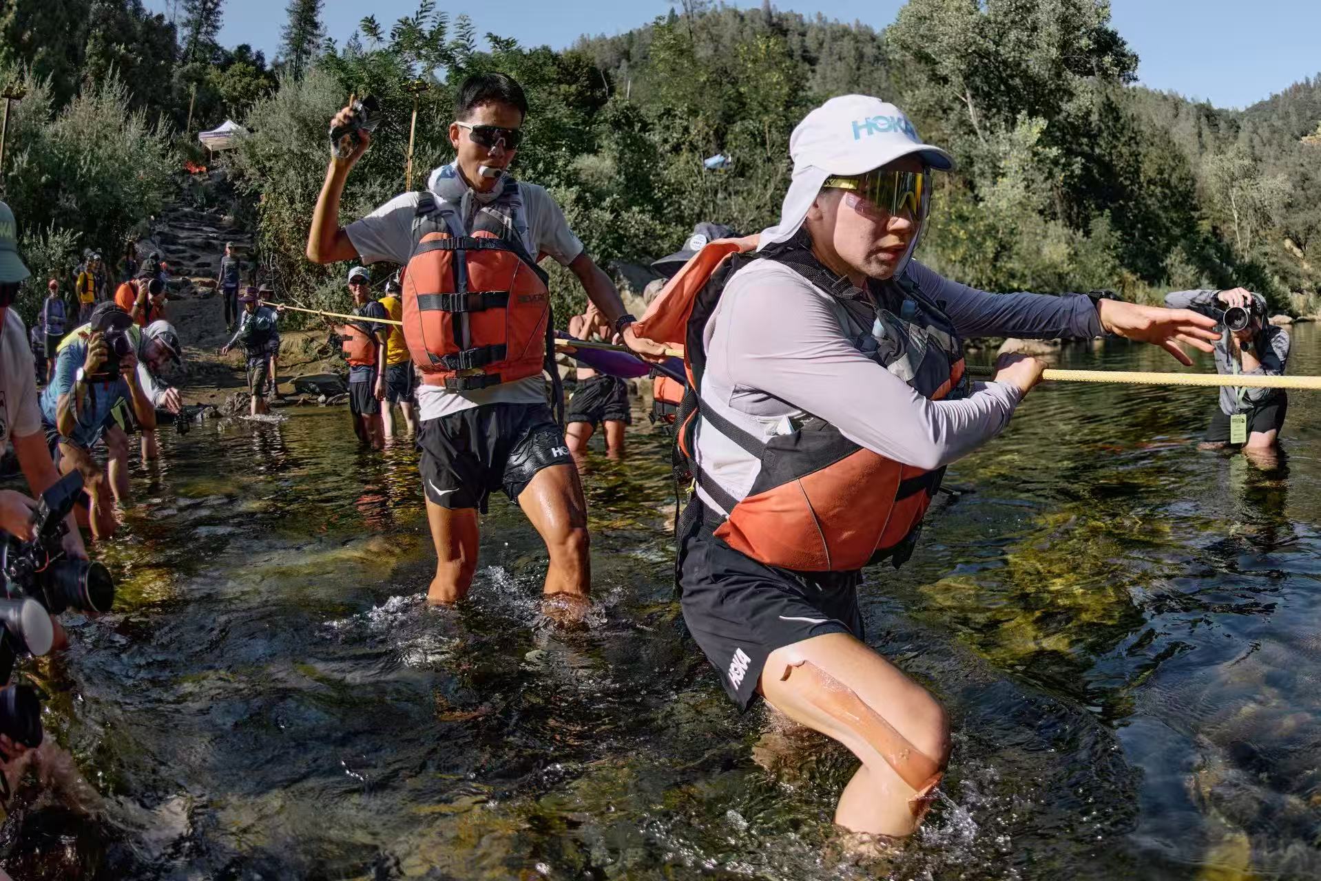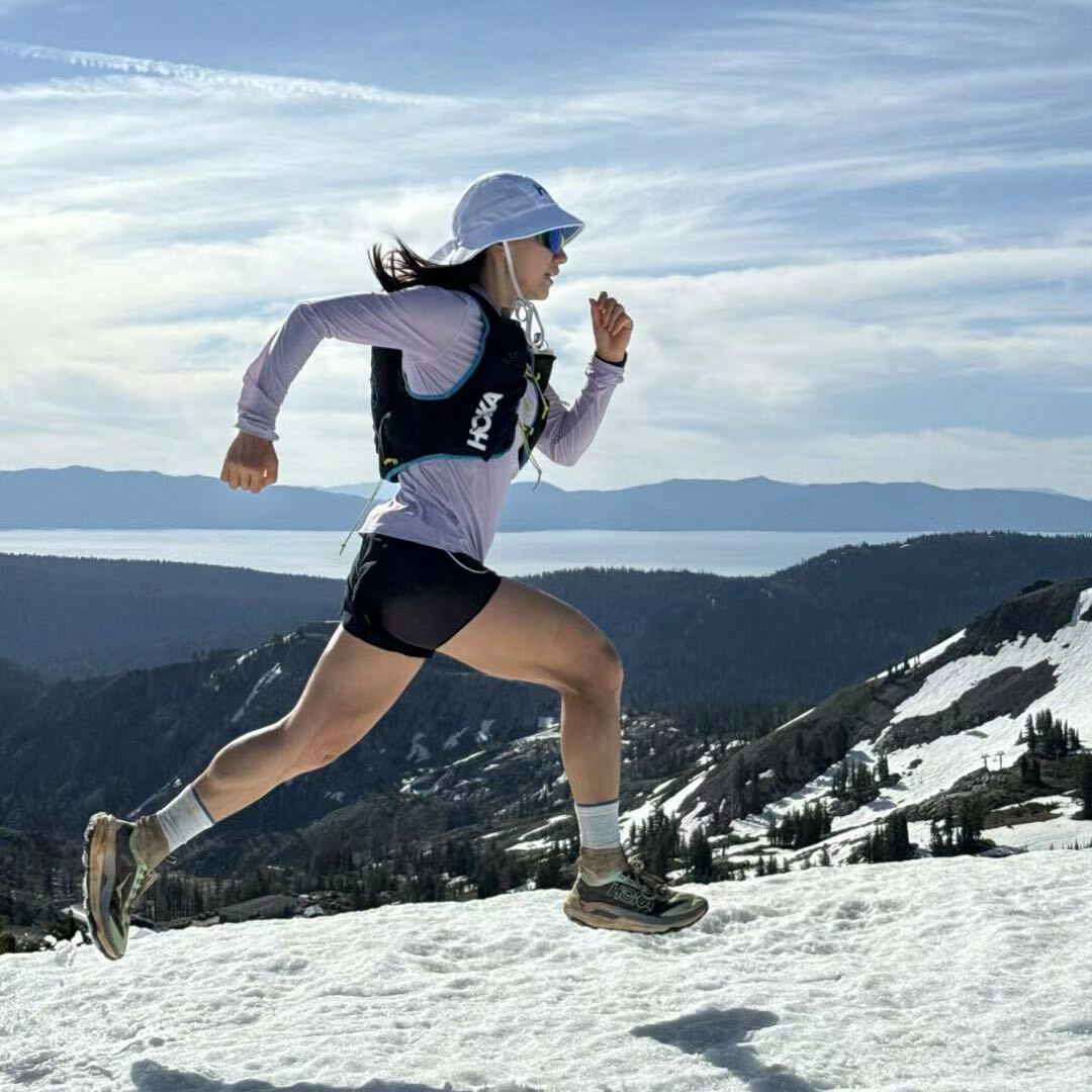 越野鞋踩过内华达山脉凸凹不平的土石路,防风帽的帽檐在山间像蝴蝶翩翩飞舞;穿着救生衣,拽着保护绳,快步蹚过齐腰深的河流;坐在补给站的椅子上狼吞虎咽,团队成员有条不紊协助换装……