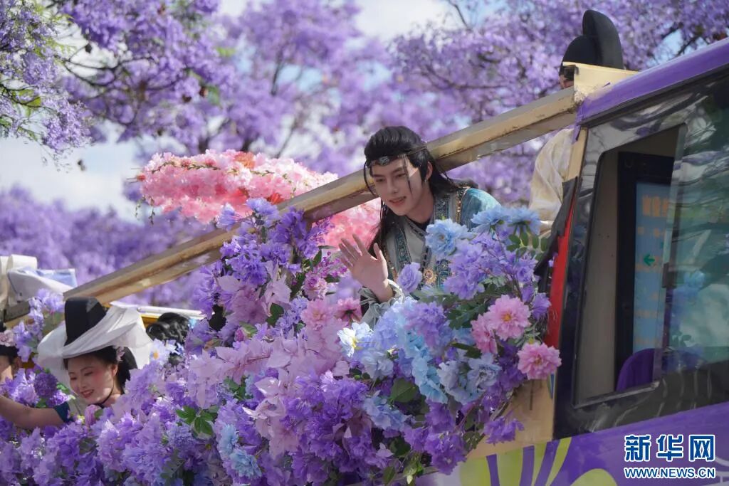 人们身着古装乘坐蓝花楹主题观光巴士。新华社记者 高咏薇 摄