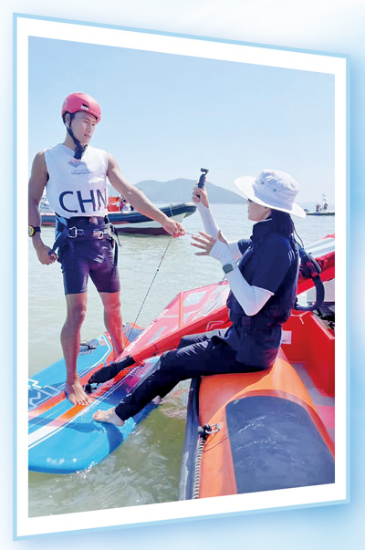 图①:徐莉佳(右)在拍摄中国帆船帆板队选手。受访者供图