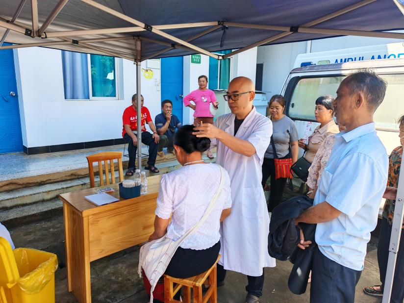 健康监测区、手册发放区、针灸理疗区……各个区域都有条不紊地运转着。截至中午12点,芒市人民医院的专家团队已为120余名群众提供了诊疗服务,测量血压、血糖70余人次。“能为乡亲们做点实事,再累也值得。”党员医生张建辉擦了擦额头的汗水,又继续为下一位群众问诊。