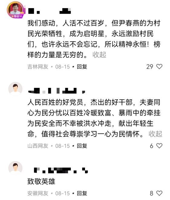 今年7月,北京遭遇连续强降雨天气。7月26日晚,在应对暴雨组织转移群众时,北京市怀柔区琉璃庙镇孙胡沟村党支部书记尹春燕和她的爱人、党员蔡永章被洪水冲走失联。他们的遗体先后被确认找到,在防汛救灾中不幸牺牲。8月14日,尹春燕、蔡永章同志被追授“北京市优秀共产党员”称号。