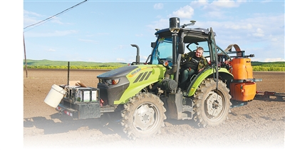 “彼得洛夫”在大豆田里驾驶全自动喷药拖拉机作业。 |