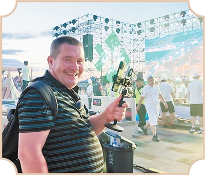 7月27日,“彼得洛夫”在逊克县举办的“中俄美食品鉴会”上直播介绍中俄特色美食。 |