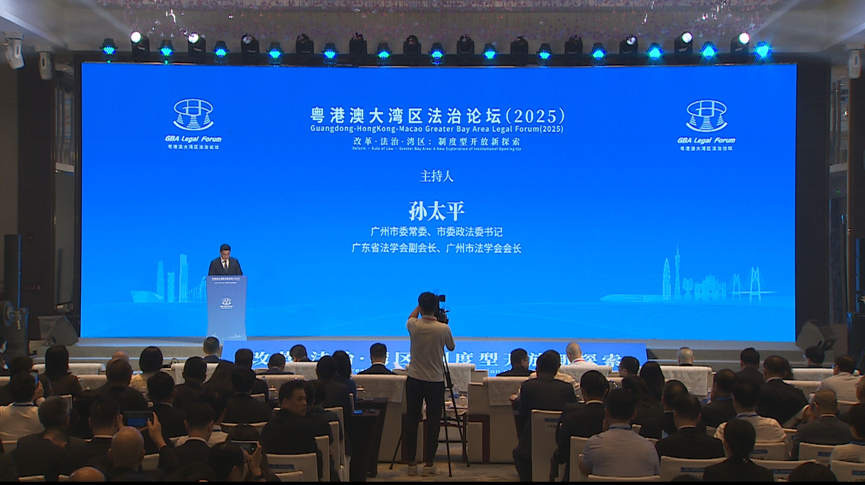中国法学会副会长兼秘书长景汉朝出席并致辞。广州市人大常委会主任王衍诗作主旨演讲。香港律政司副司长张国钧视频致辞。澳门法务局副局长邱显哲致辞。广州市委常委、市委政法委书记、市法学会会长孙太平主持开幕式,并发布论坛成果文件《粤港澳大湾区法治论坛(2025)天河共识》。