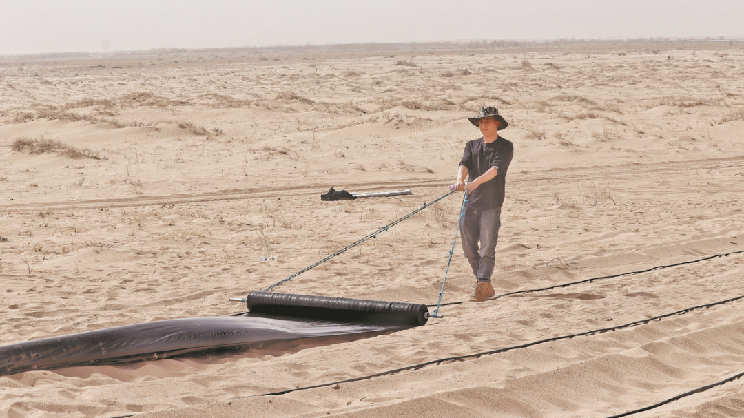 仲麟在沙漠进行覆膜滴灌实验。(麻万星 摄)