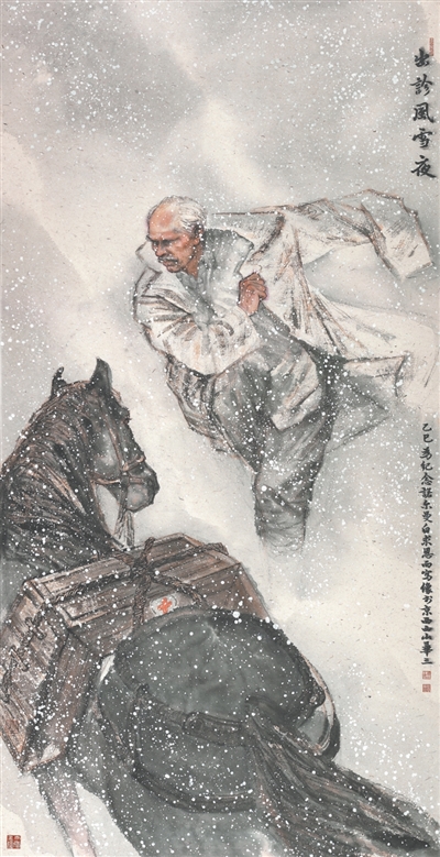 黄华三中国画《出诊风雪夜》,创作于2025年。一代代美术工作者都在尝试用自己的艺术语言表现白求恩精神。这件作品突破对战地手术的场景再现,通过风雪夜出诊的情境描绘,凸显医者在艰苦环境中的坚守与担当。艺术处理上,作者以俯视的构图和留白、渲染、敲雪等技法,强化了风雪肆虐的情景和主人公勇往直前的姿态,凸显这位国际共产主义战士的精神光芒。
